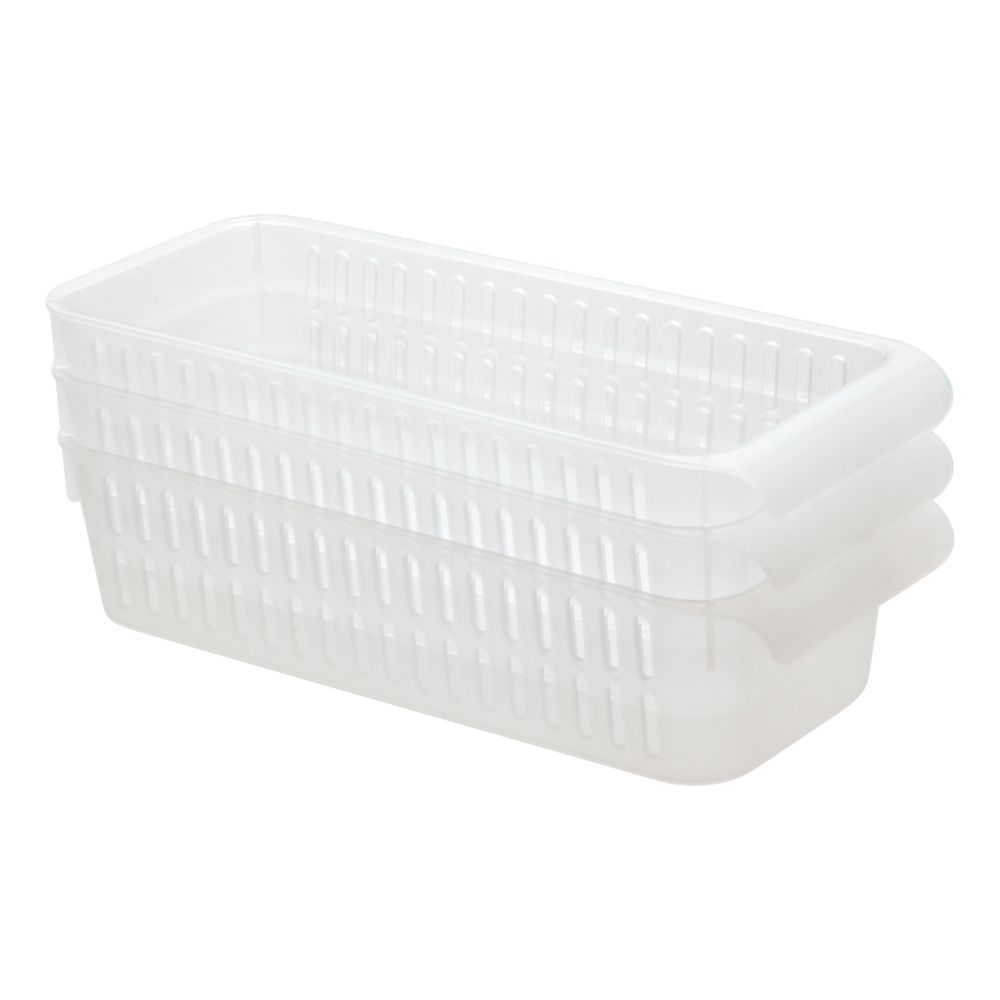 Set de 3 canastos de plástico. Tienen un tamaño de 30x12.7x7 cm.