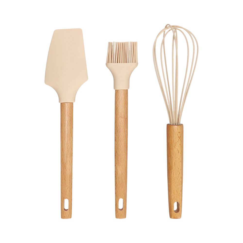 Set de 3 utensilios para cocinar de silicona con mango de madera de haya. Producto libre de BPA