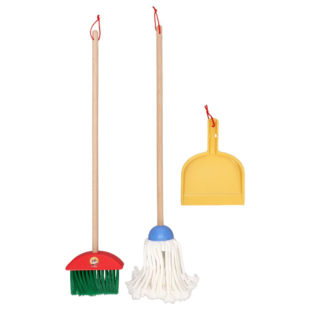 Set de aseo de juguete de madera. Contiene escobillón, mopa, pala y plumero.