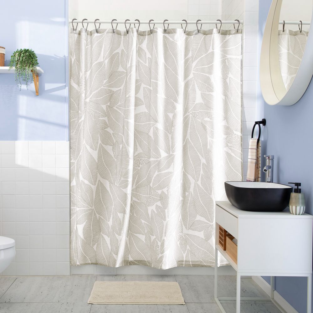 • Incluye: 1 Cortina de baño 180x180 cm, 1 tapete de baño 43x60 cm y 12 Argollas plásticas.