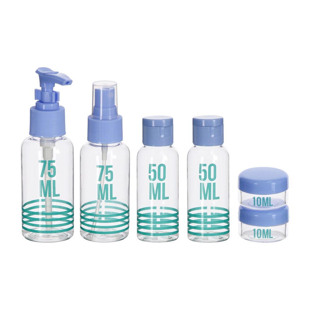 Set de botellas para guardar tus cosméticos durante tus viajes. Ideal para guardar el shampoo, el bálsamo, las cremas y otros productos. Set incluye 3 botellas de 75 ml, 1 botella de 50 ml y 2 potes con tapa 10 g.