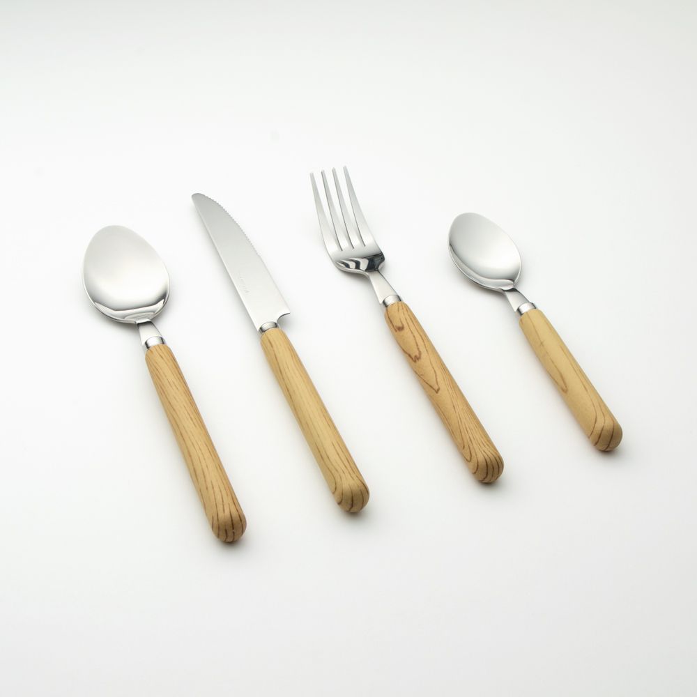 Set de cubiertos de acero inoxidable con base de color. Incluye tenedor, cuchillo, cuchara sopera y cuchara de postre.