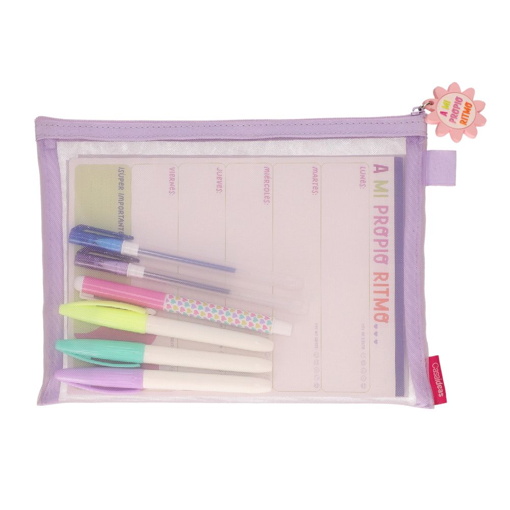 • Incluye: 1 estuche malla,1 block planificador semanal 60 hojas, 2 Hojas de stickers, 3 resaltadores con timbre, 2 bolígrafos de gel con brillos y 1 Bolígrafo de tinta negra