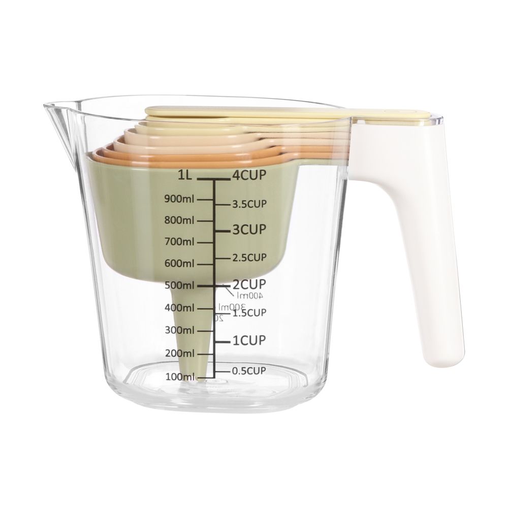 Set de jarra, vasos, cucharas y embudos para cocinar. Incluye 9 piezas= 1 Jarra (1000 ml), 1 Vaso (250 ml), 1 Vaso (125 ml), 1 Vaso (85 ml), 1 Vaso (60 ml), 3 Cucharas medidoras, 1 Embudo.