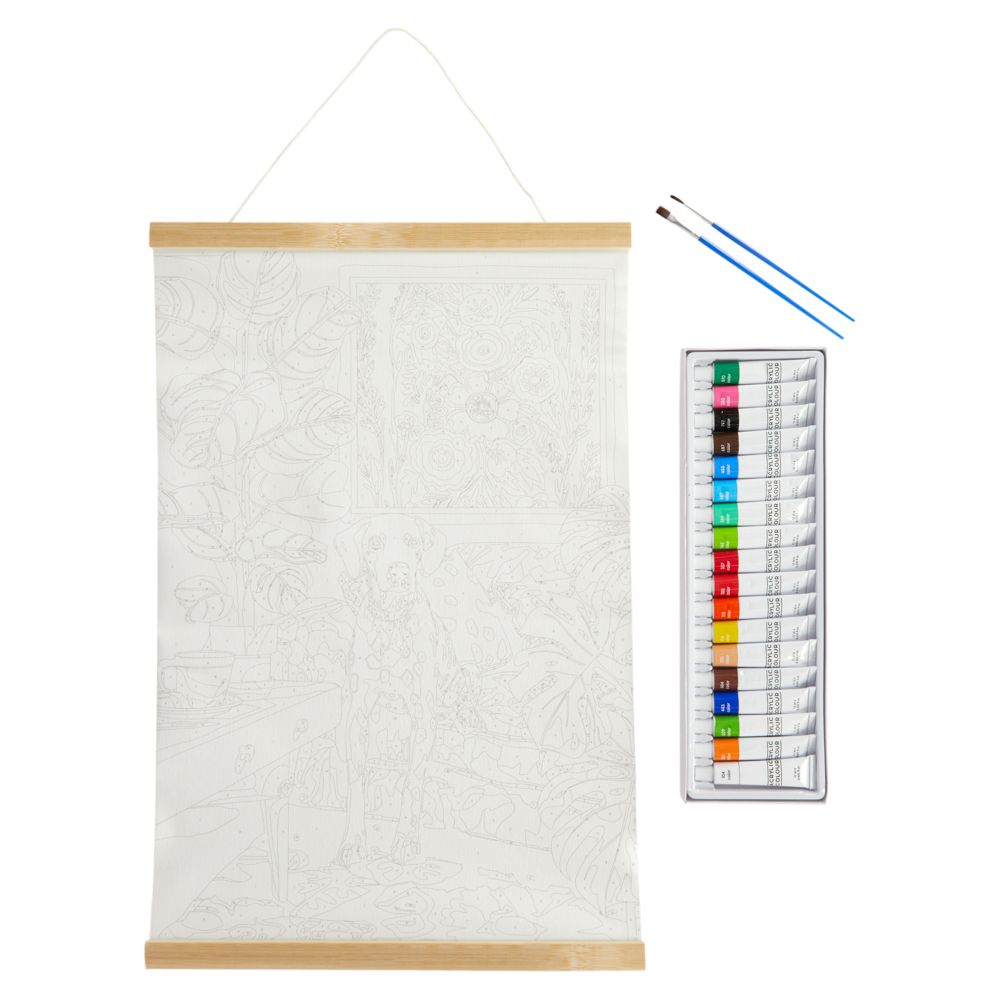 Set de lámina para pintar con colores. con materiales para pintar y colgar tu arte. Incluye instrucciones. Contiene: 1 lienzo ilustrado, con números como guía para pintar, 18 pinturas acrílicas (12 ml cada tubo), 2 pinceles, 2 soportes de bambú con cuerda de algodón listo para colgar.