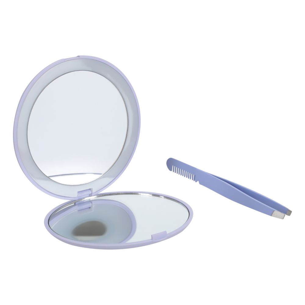 Set de espejo con luces LED y con pinza biselada y borde con cepillo. El espejo tiene un diámetro 9x1.8 cm.