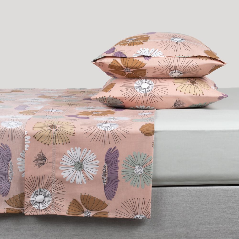 Set de sábanas de algodón y poliéster 144 hilos con estampado. Incluye: sábana de cajón, sábana plana y dos fundas de almohada. Ideal para camas King XL. Cuenta con certificación Oeko-Tex Lavar a máquina con agua tibia, 40ºC. No blanquear. No usar secadora. Planchar a temperatura media. No lavar en seco. Lavar colores oscuros por separado.