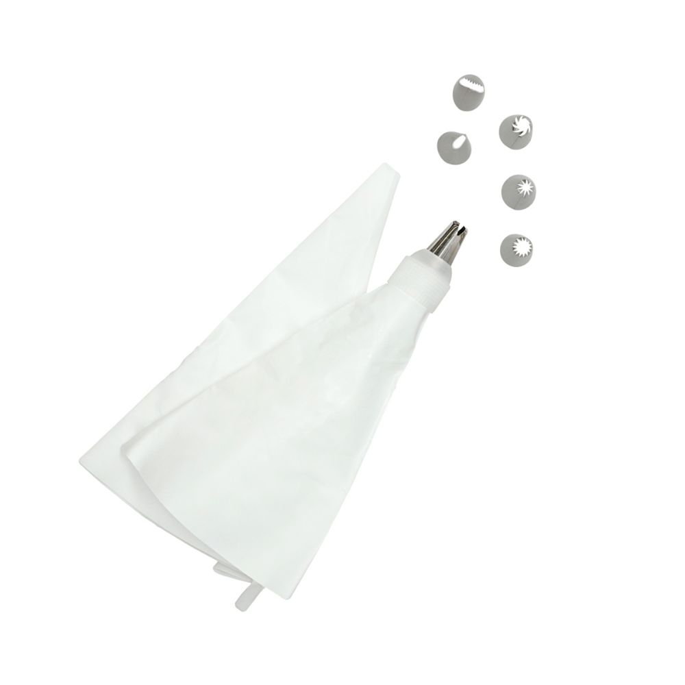Set de contiene 3 mangas, 6 boquillas decorativas de acero inoxidable y 2 adaptadores. Adaptadores: 5.5x4 cms. Boquillas: 4x2.5 cms. Manga: 30x16 cms. Apto para lavavajillas.