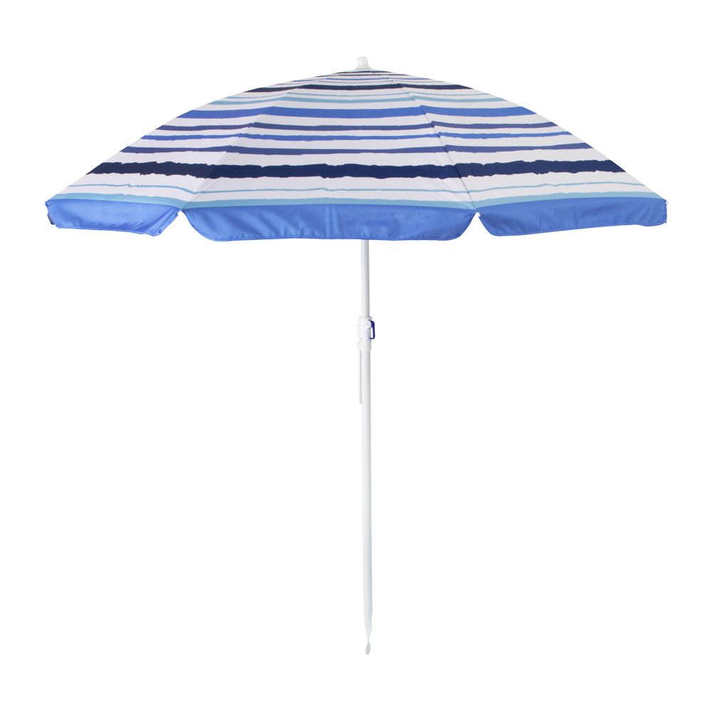 Sombrilla de poliéster estampado con protección de rayos UV con estructura de metal y manivela para facilitar la instalación en la arena y ajustar el ángulo de posición. Incluye bolso de transporte. Tiene un diámetro de 180 cm. Requiere armado (Incluye instrucciones).