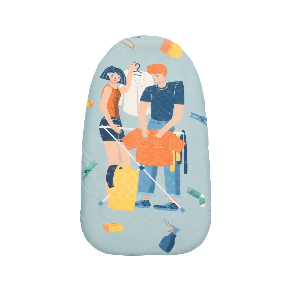 Tabla de planchar de mesa con estructura de plástico, cubierta de tela acolchada con patas plegables y gancho para colgar.