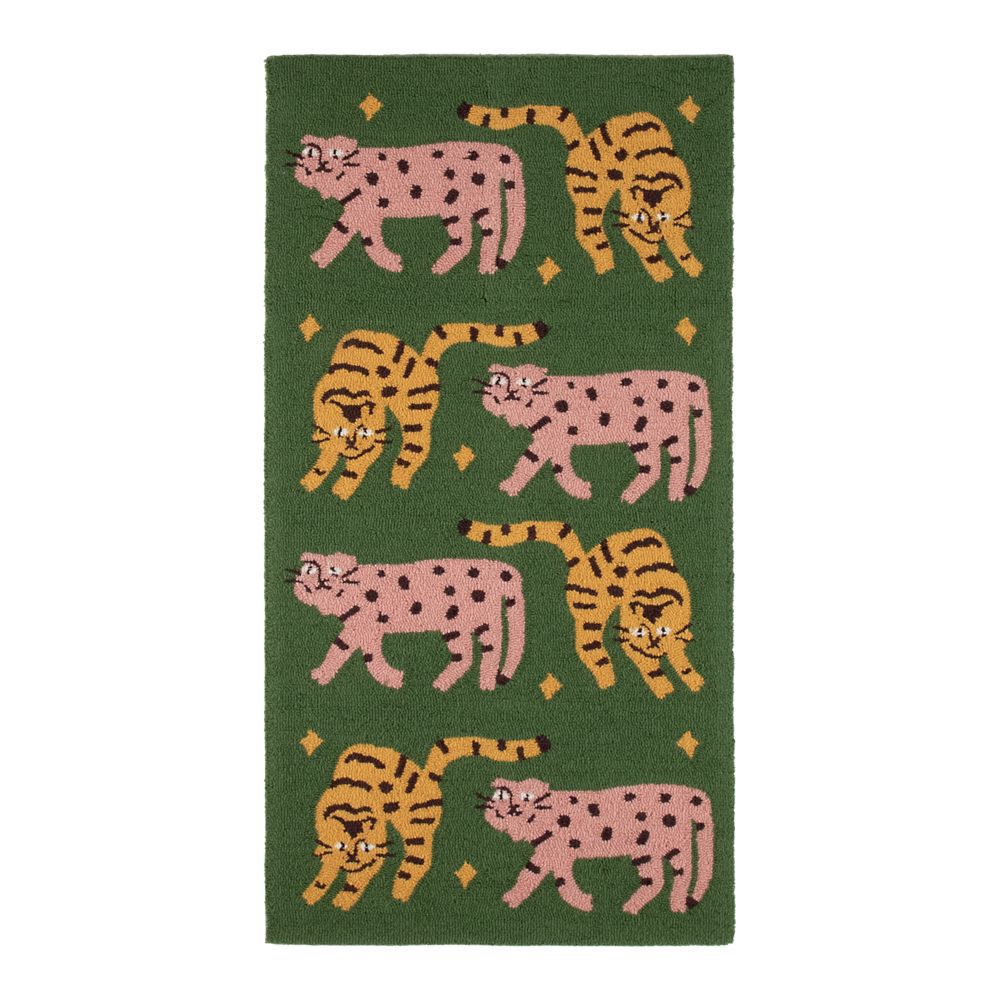 Tapete de poliéster con tejido boucle (gancho) tiene base inferior sin antideslizante. Tiene un tamaño de 70x140 cm.
