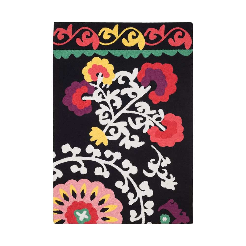 Tapete de Poliéster con tejido boucle (gancho). Tiene base inferior sin antideslizante. Tiene un tamaño de 120x180 cm.