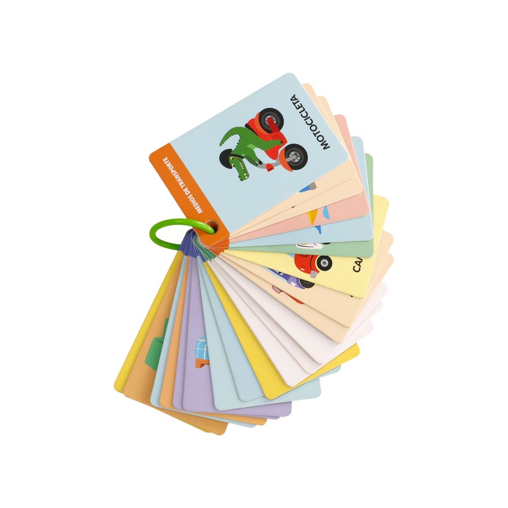Set de 28 tarjetas didácticas con figuras de transportes, formas y objetos para que los pequeños fomenten el lenguaje, la audición, el pensamiento lógico y la percepción visual. Ideal para mayores de 2 años.