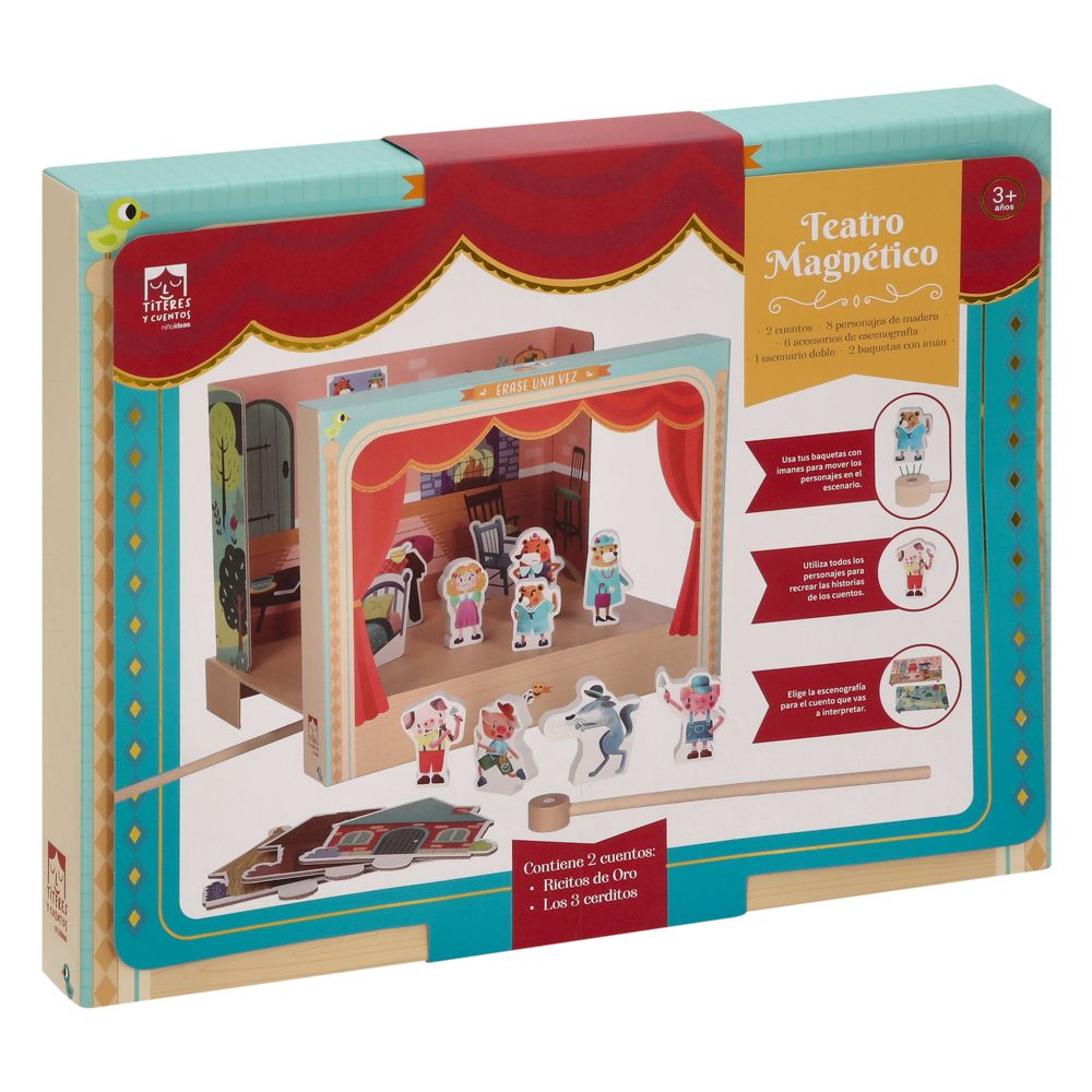Teatro magnético de madera con 8 personajes para contar cuentos clásicos (Ricitos de oro y Los tres cerditos). Ideal para mayores de 3 años.