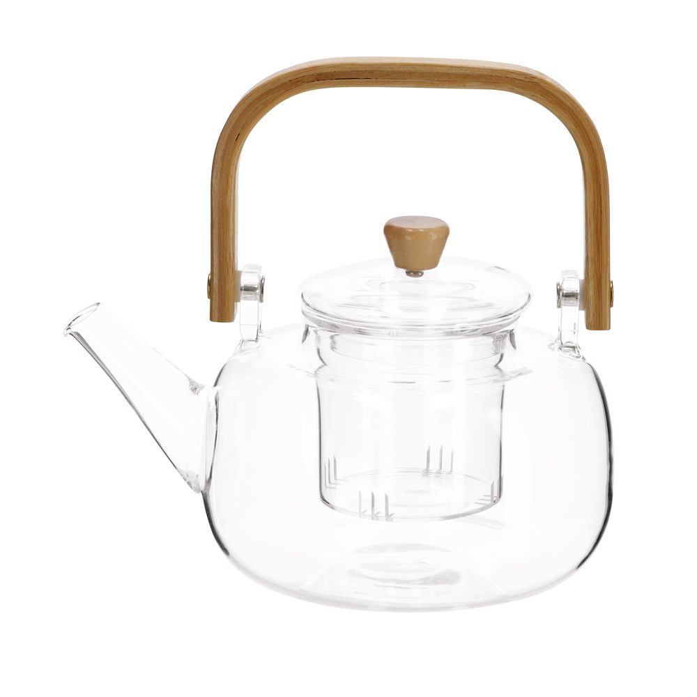 Tetera de vidrio borosilicato con diseño e infusor. Tiene una capacidad de 1 l.