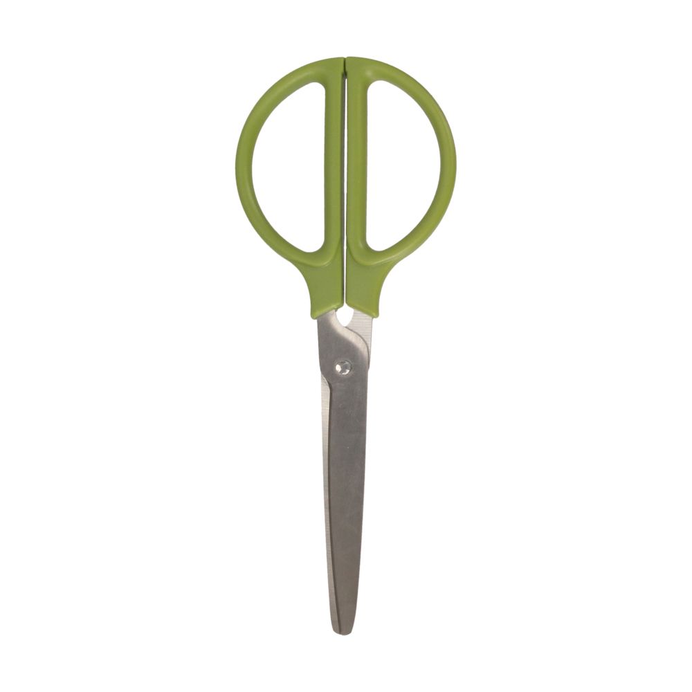 Tijera de metal con mango de plástico. Utilizar bajo supervisión de un adulto.