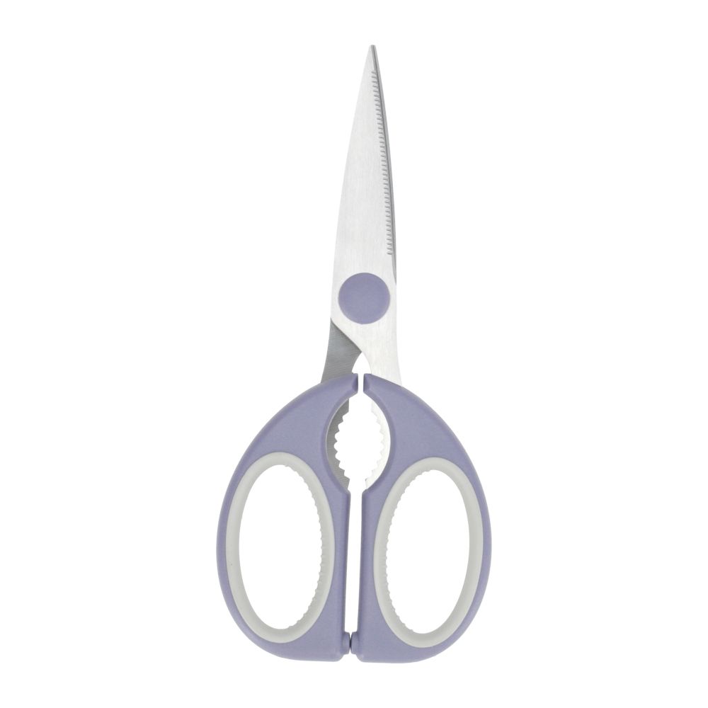 Tijeras de acero inoxidable con revestimientos de polipropileno. Cuenta con un tamaño de 22.5x9.4x1.3 cm.