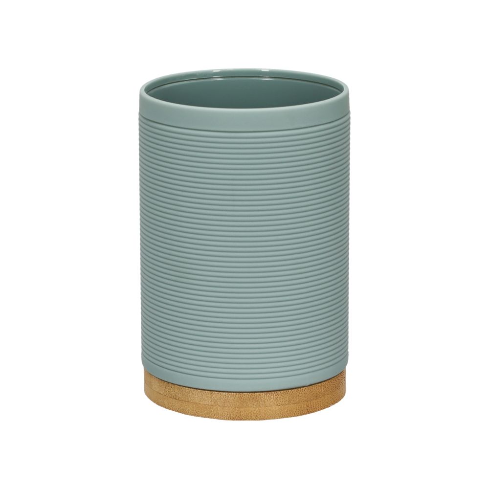 Vaso de plástico ABS y madera de bambú. Ocúpalo para poner cepillos de dientes u otras cosas necesarias en el baño. Tiene un diámetro de 7.1x11 cm.