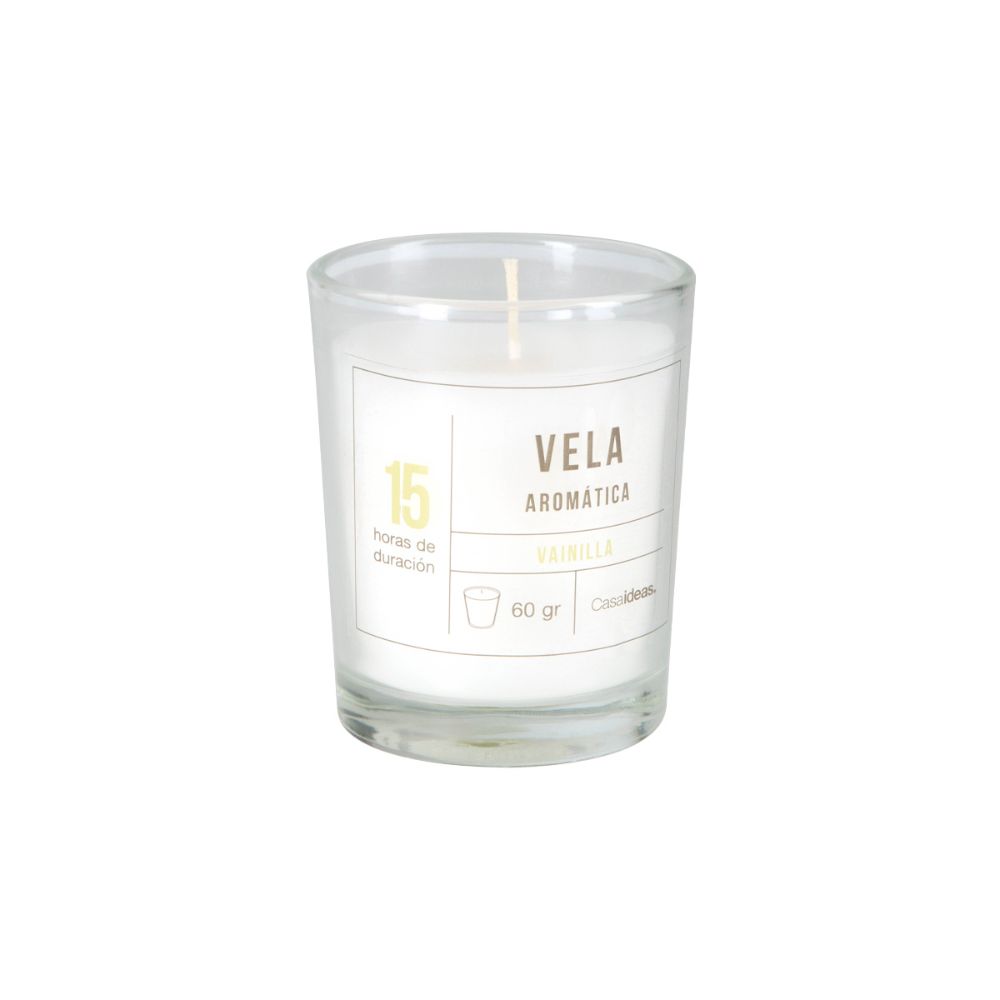 Vela con contenedor de vidrio aroma vainilla. Tiempo duración: 15 horas. 5.6x6.5 cm. No dejar prendidas sin supervisión.