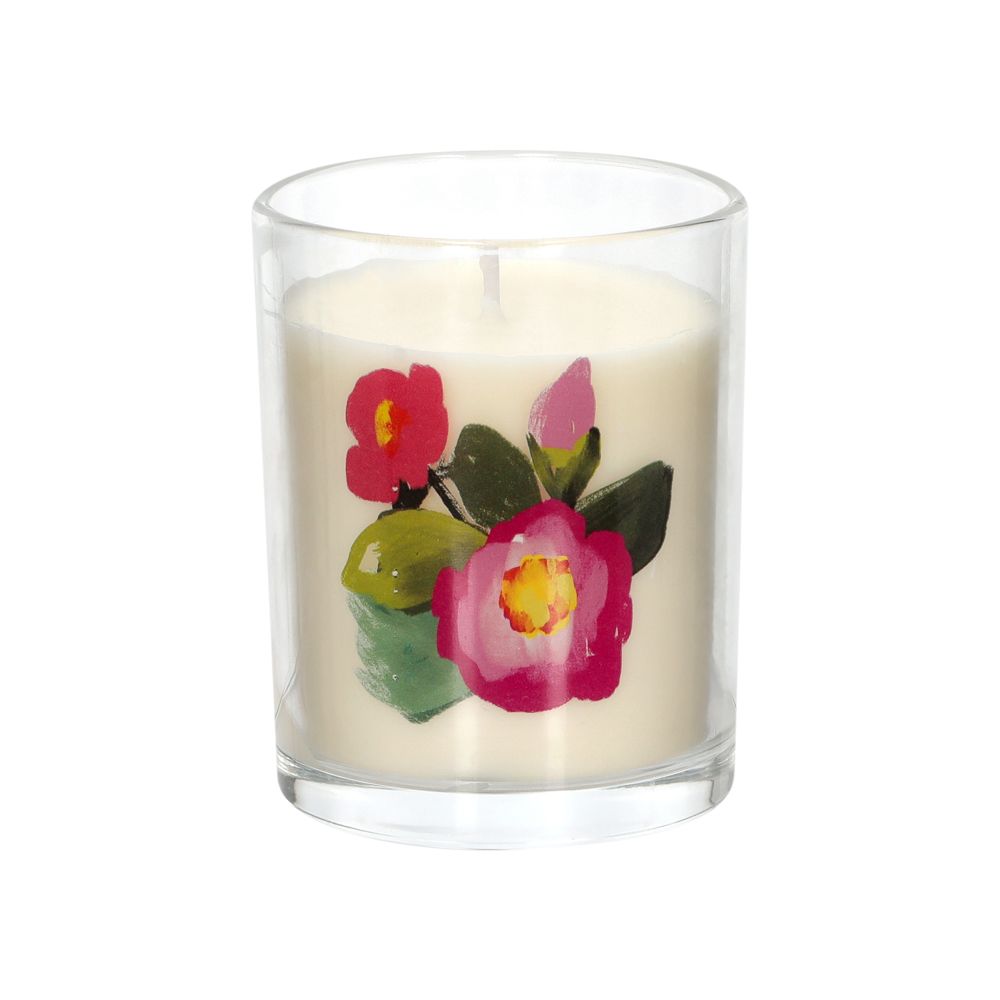 Vela de vidrio con estampado y aroma a frutos rojos. 198 g. Tiene una duració de 26 horas.