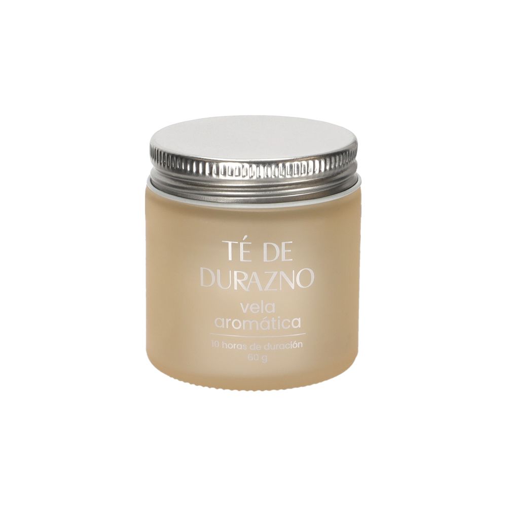 Vela con aroma a té de durazno en un contenedor de vidrio y con tapa metálica. Tiene hasta 10 horas de duración