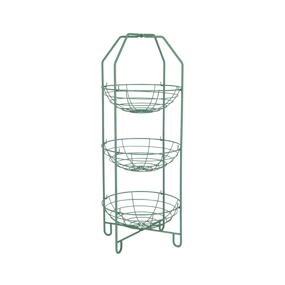 Verdulero con 3 canastas de metal electropintado. Este producto requiere armado (Incluye instrucciones).Tiene un diámetro de 29.5x73 cm. Limpiar con paño húmedo.