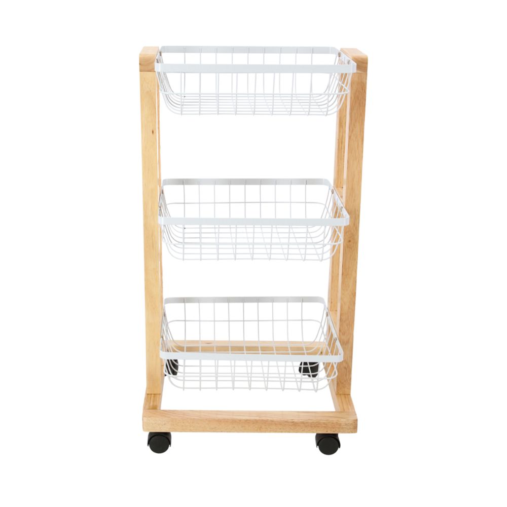 Verdulero de madera de caucho con 3 canastas de metal electropintado y ruedas. Requiere armado: si (incluye instrucciones). Limpiar con paño húmedo