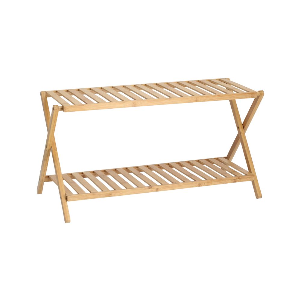 Zapatero plegable de madera de bambú con 2 niveles. Este producto viene plegado (incluye instructivo) y resiste hasta 5 kg. Tiene un tamaño de 69.7x35.5x34.1 cm. Limpiar con paño húmedo.